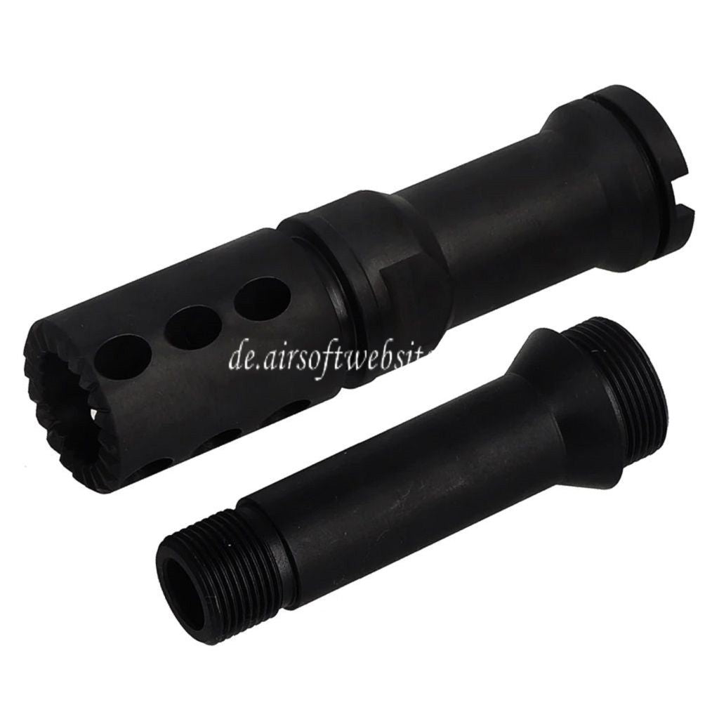 BBT CNC Steel Mündungsfeuerdämpfer mit Outer Barrel Extension -14mm CCW Gegen den Uhrzeigersinn Geeignet für VFC FN M249 Serie GBB SMG Schwarz